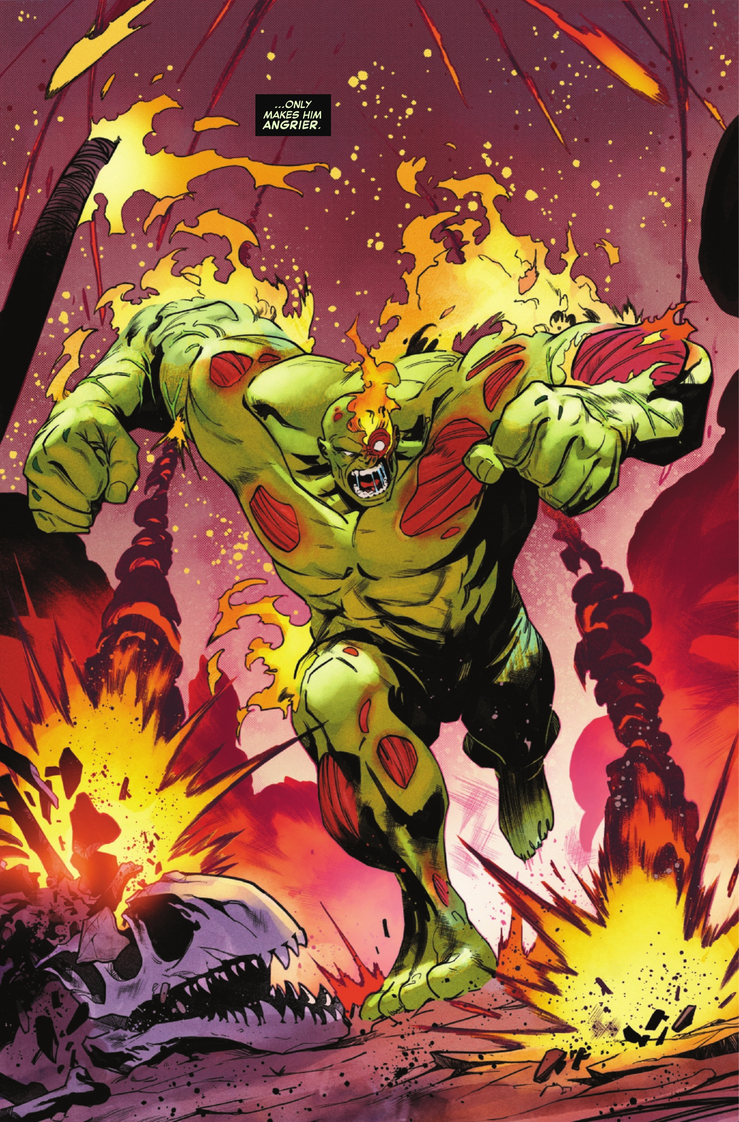 The Hulk is right where the asteroid landed, and everything around him immediately dies. Other creatures suffer for days or even months as the planet recovers from the impact. However, despite this deadly environment, the Hulk survives, driven by his anger and the immense pain he’s feeling. The story emphasizes the brutal details, even pointing out that the heat isn’t enough to harm the Hulk’s body.