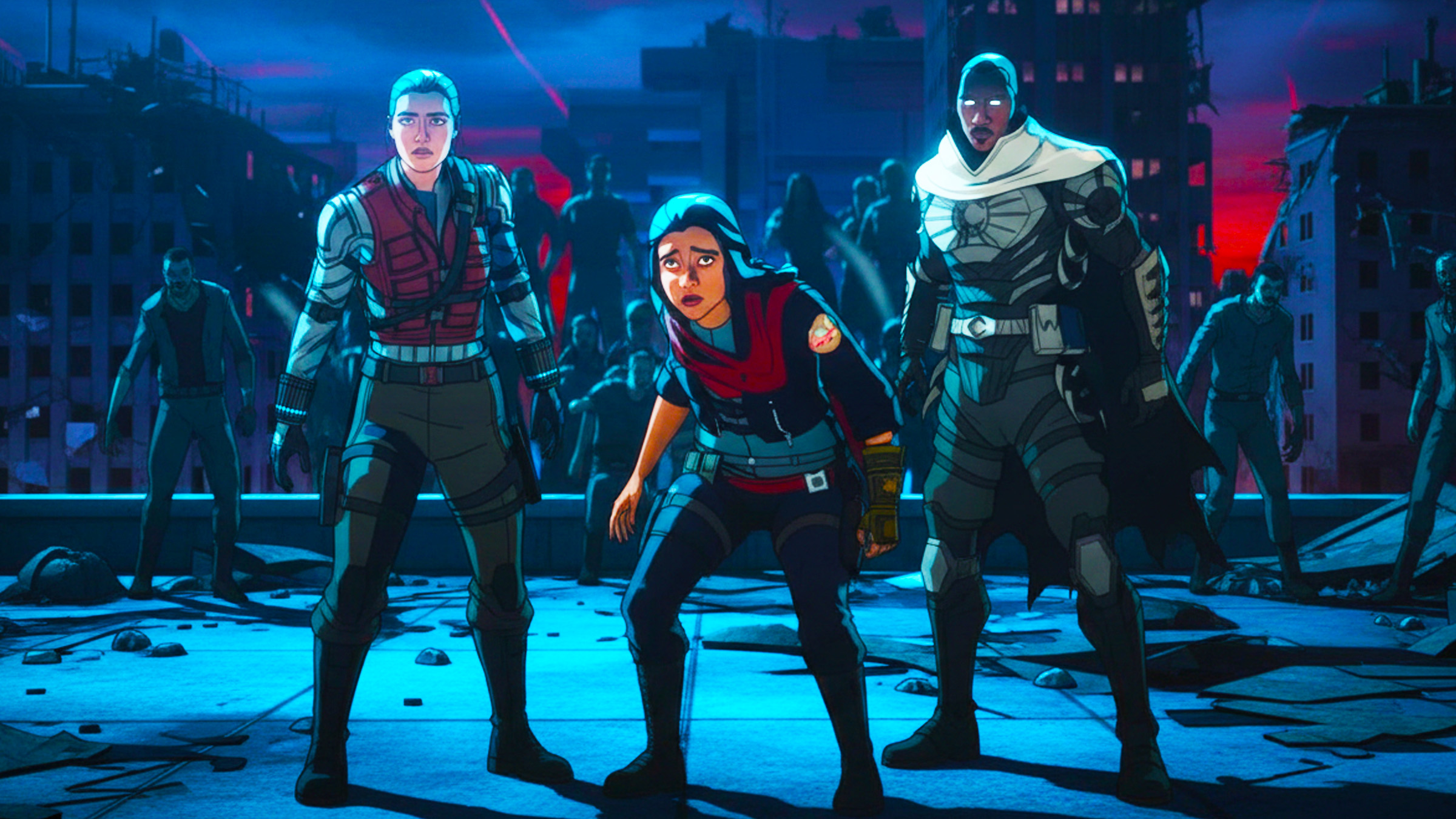 Kamala Khan, played by Iman Vellani, has grown since we first met her in *Ms. Marvel*, and it was fun to see Florence Pugh as Yelena Belova, David Harbour as Red Guardian, Wyatt Russell as US Agent, and Hannah John-Kamen as Ghost back in *Thunderbolts*. However, some heroes from *Marvel Zombies* haven’t appeared in the main MCU since their first appearances. This includes Simu Liu’s Shang-Chi, Awkwafina’s Katy, and Moon Knight – portrayed by Oscar Isaac as Marc Spector in *Moon Knight*, but by Todd Williams as Eric Brooks, Blade, in *Marvel Zombies*.