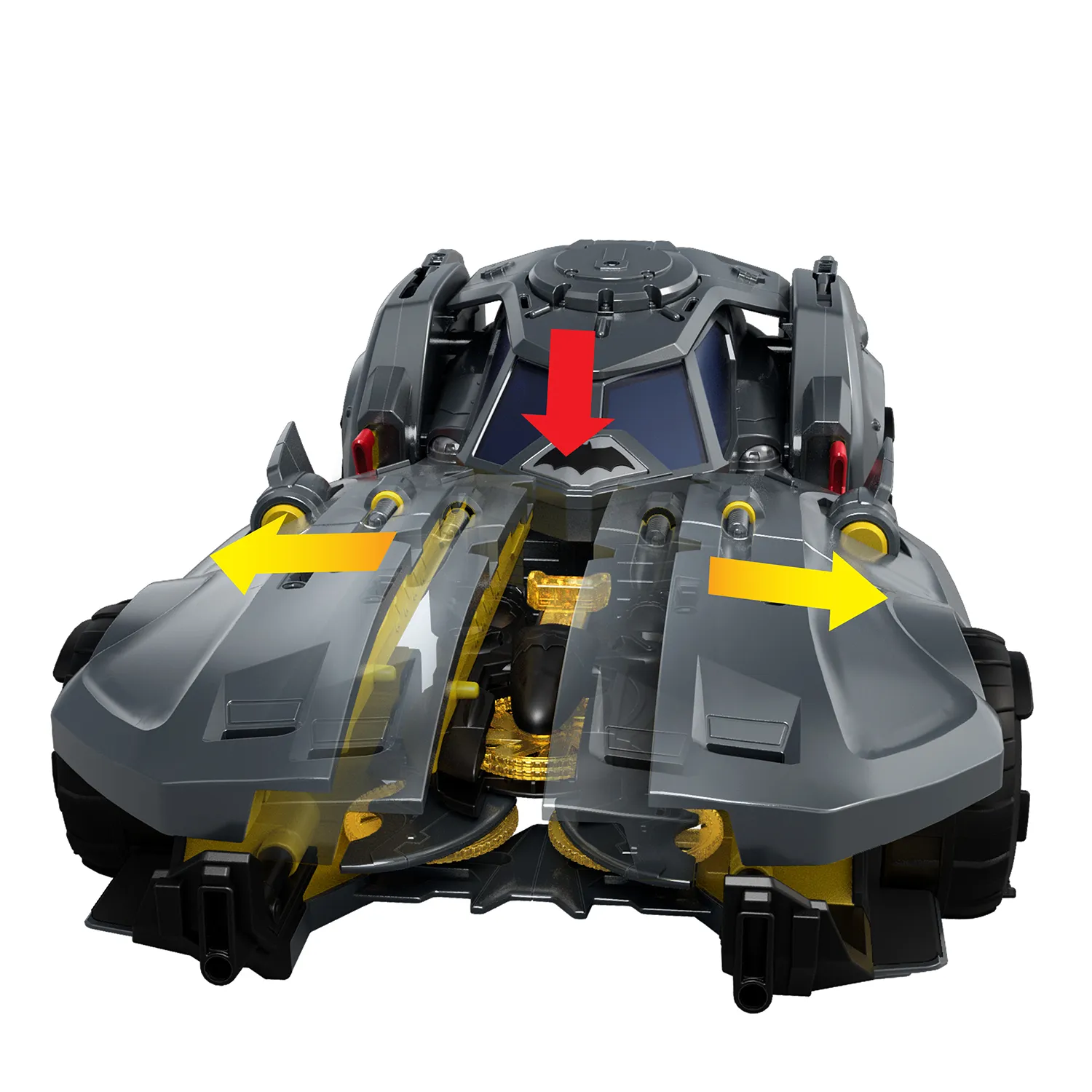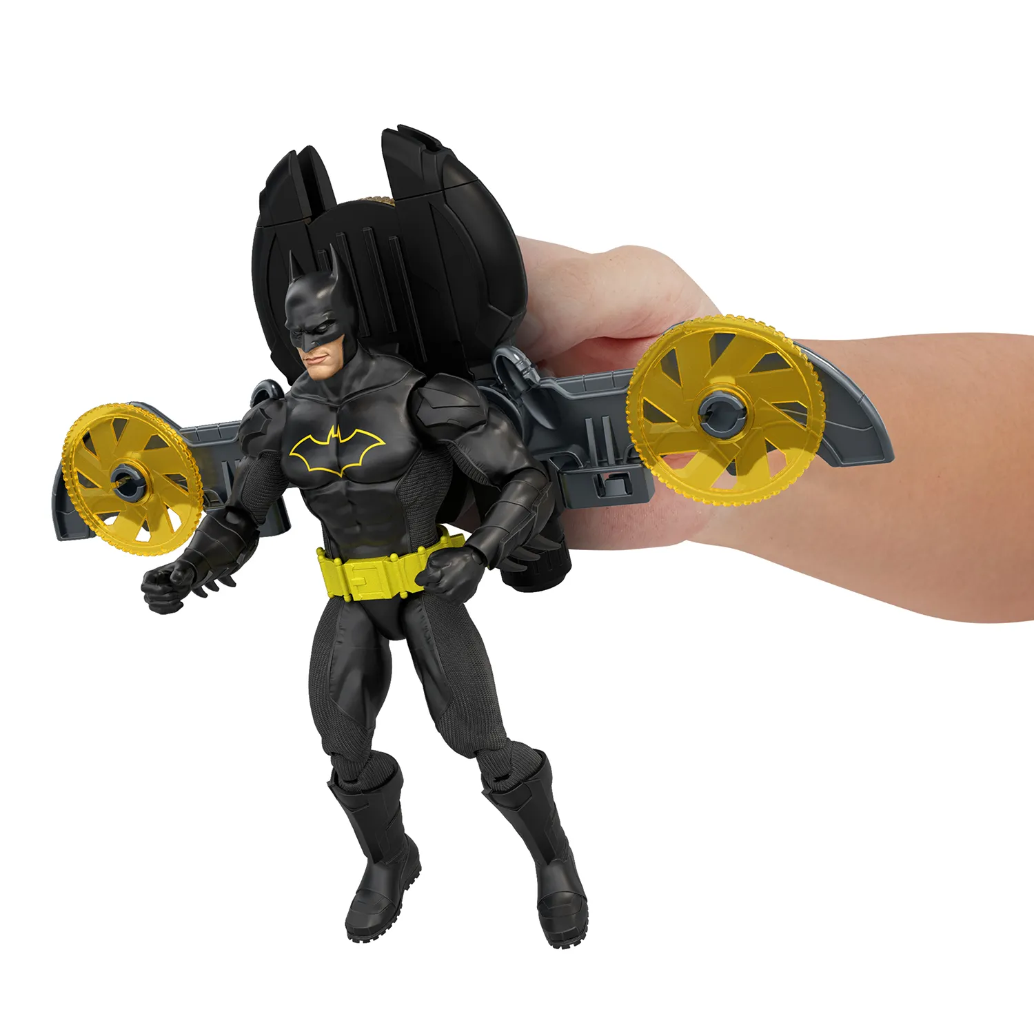 The Batmobile features a disc-launching Bat-Drone stored in its Weapons Bay. What’s really cool is that you can remove the Bat-Drone and connect it to a Batman action figure, transforming it into a jetpack!