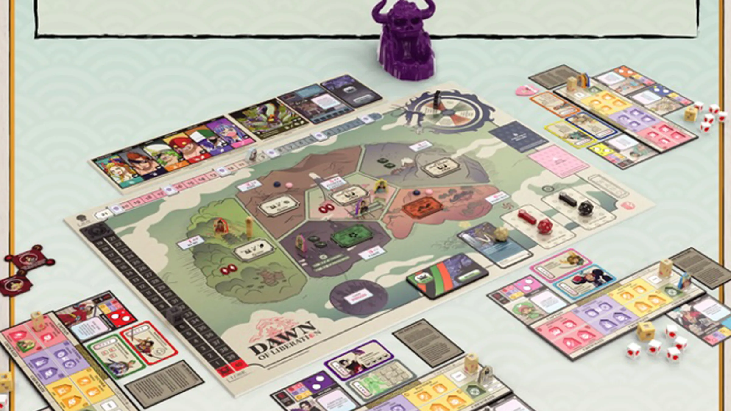 When you first unpack this game, what really strikes you is how deeply it’s connected to the One Piece world, especially the Wano Arc. The artwork on the boards and cards is all new, showcasing Wano and Onigashima beautifully. It doesn’t just show these places, though – it really dives into their history and important locations, brought to life through characters like the Red Scabbards and a fantastic, see-through purple dice tower designed like Onigashima itself.
