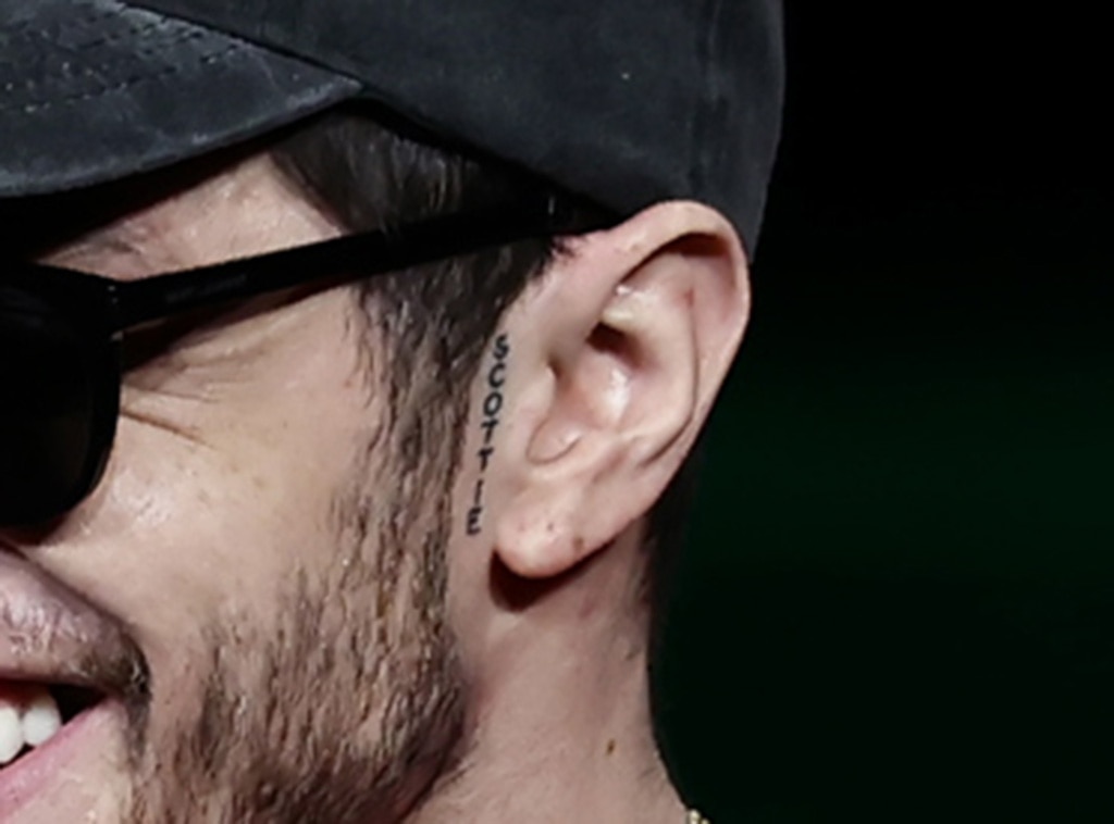 While at CinemaCon promoting his new movie, How to Rob a Bank, Pete Davidson showed off a small, new tattoo. The simple black ink design, the word “Scottie” written vertically, is located on the side of his face, just above his ear and below his beard.