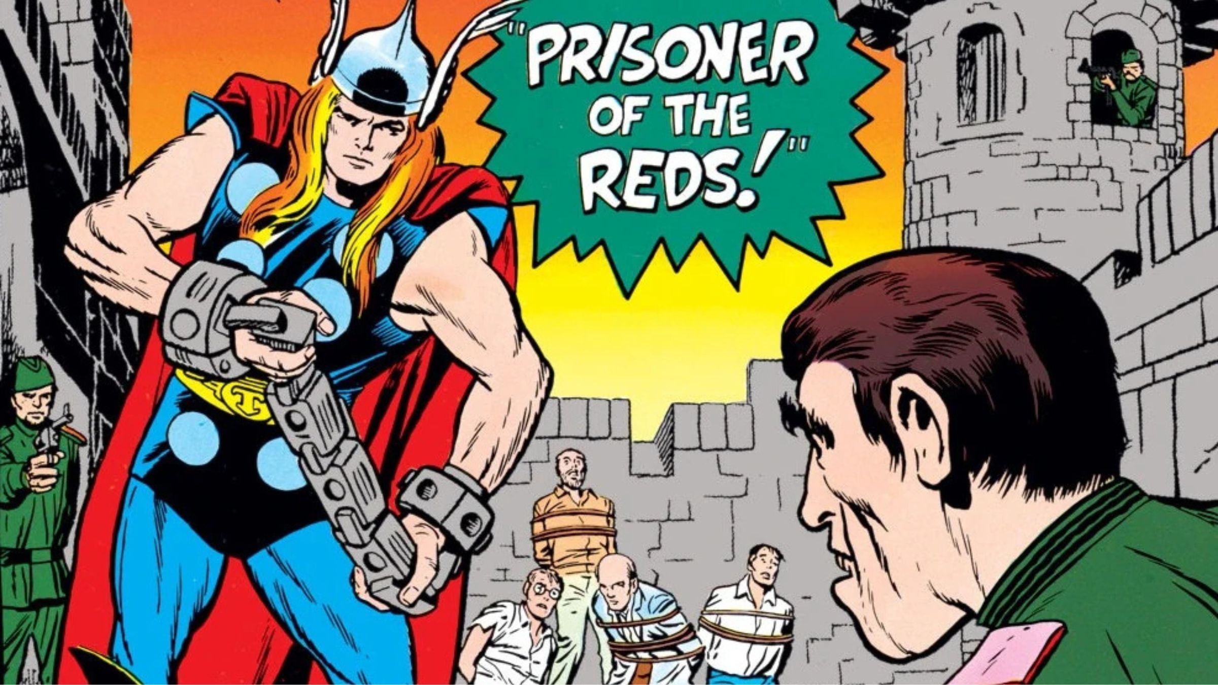 Donald Blake volunteers to pose as a defector and travel to the Soviet Union. Once there, he discovers the scientists working with the Communists are actually under hypnosis and being forced to collaborate. Blake transforms into Thor and battles the Soviet military to free them. Similar to the situation with the Executioner, this incident involved Thor becoming entangled in a political conflict.