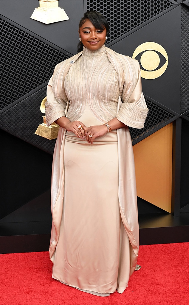 Olivia, the oldest of Colin Hanks and Samantha Bryant’s two daughters, wore a long navy blue dress with a sparkly strap over her left shoulder. (See more Grammys red carpet fashion here.)