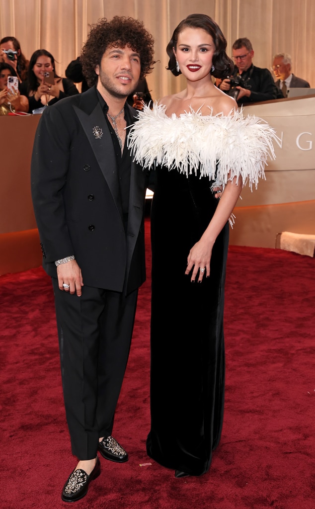 Selena turned heads in a striking black Chanel dress with dramatic white feather sleeves. Benny complemented her look in a classic black suit, accessorized with a bold silver chain and stylish loafers.