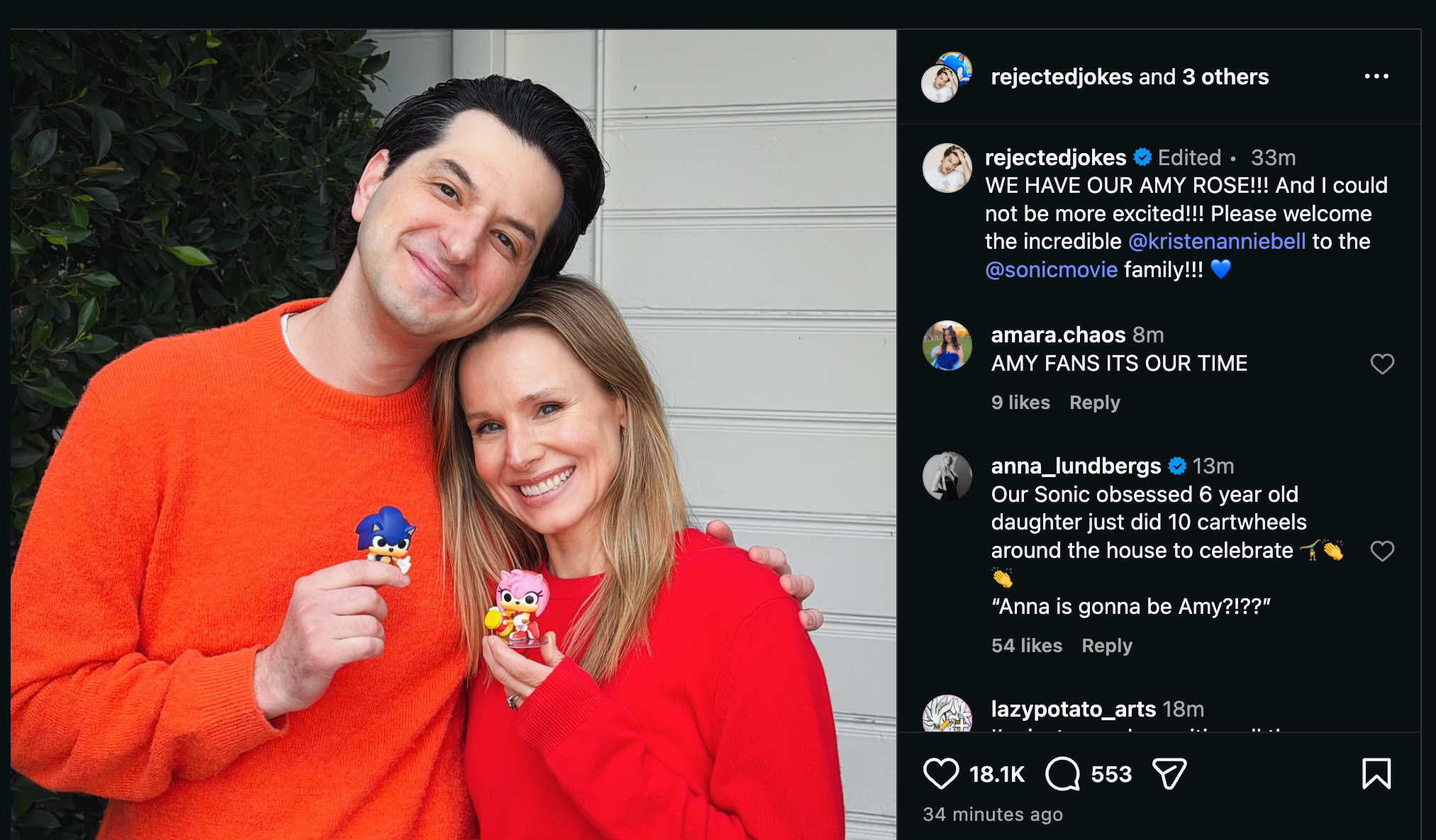 Kirsten Bell, known for her role in The Good Place, will be voicing Amy Rose in Sonic the Hedgehog 4. Ben Schwartz, who voices Sonic, announced the news on Instagram, sharing a photo of himself with Bell, each holding a figurine of their character. He expressed his excitement about welcoming her to the Sonic the Hedgehog movie family.