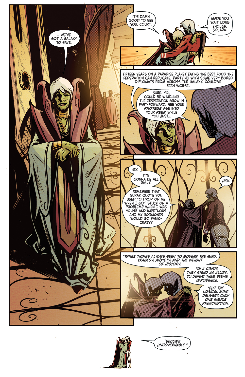 What struck me most about this storyline is that Wowie’s doubts about being First Officer aren’t immediately obvious. It’s not until we see their meeting with Solara that we begin to understand they’re reconsidering their position. Their conversation with the man in the park also feels significant. It makes you wonder what finally led Wowie to decide to step down.