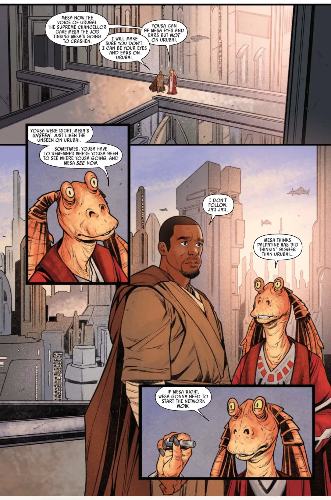 The first issue of Star Wars: Jar Jar begins shortly after Chancellor Palpatine gains more power. Senator Binks travels to Quarrant City on the planet Urubai to meet with an ambassador. But the meeting isn’t what Jar Jar expects. When Jedi Knight Kelleran Beq arrives and rescues him from a robbery, he reveals the meeting was a setup – he needs Jar Jar’s help to uncover a hidden truth.