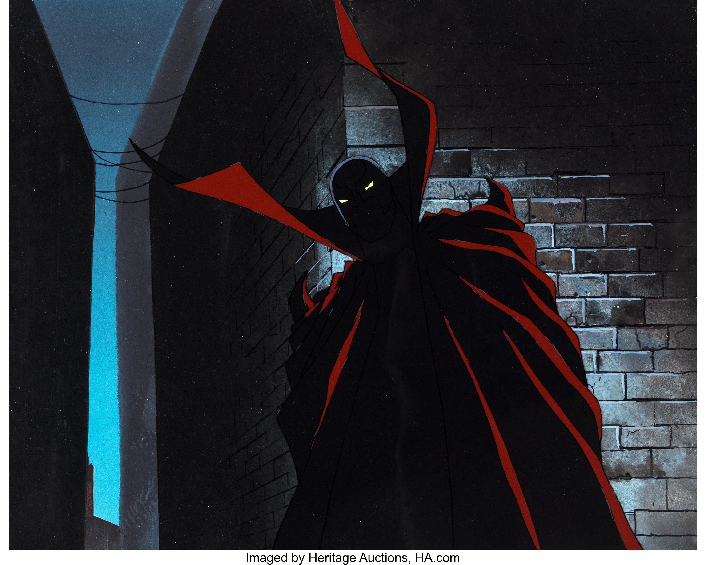 Let’s look at a popular comic book character outside of Marvel and DC: Spawn, created by Todd McFarlane. While Spawn first gained fame in comics, a great animated series on HBO in 1999 really brought the dark and intense feel of the comics to life. Now, Heritage Auctions is offering a production cel from that series – specifically, a 12-field cel of Spawn moving through a shadowy alley. The auction includes the original animation drawing as well, and you can start bidding with just $1.