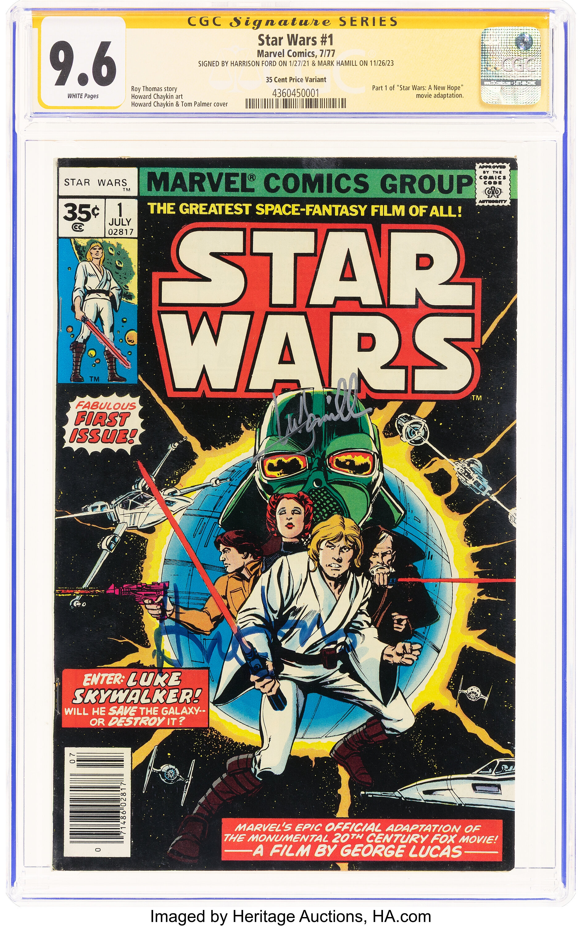 Comic book fans have two exciting auctions coming up, one for each of two popular franchises. The first features a 1977 Marvel Comics issue of Star Wars #1 – a highly graded (NM+ 9.6) copy of the 35-cent variant. What makes this copy especially valuable is that it’s signed by both Mark Hamill and Harrison Ford, which helps explain the current bid of $37,000. The auction will close in 9 days.