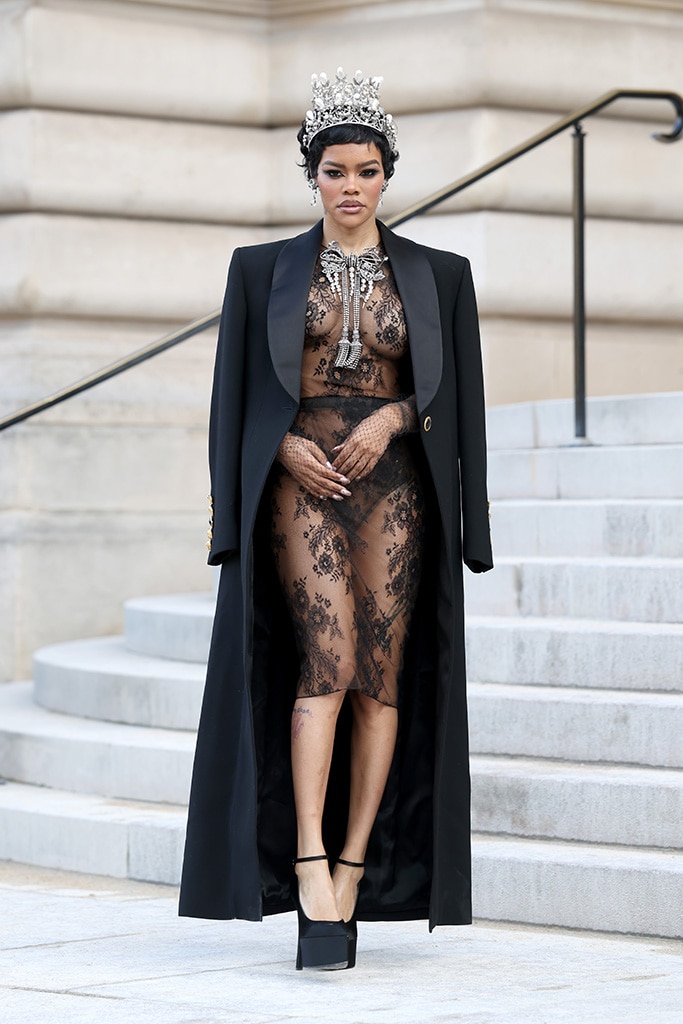 Teyana, 35, turned heads on her outing with a bold outfit: a short, see-through black lace dress. She completed the look with a long black coat, black heels, and statement silver jewelry, including a sparkling diamond bow necklace, dangling earrings, and a crown adorned with both diamonds and pearls.