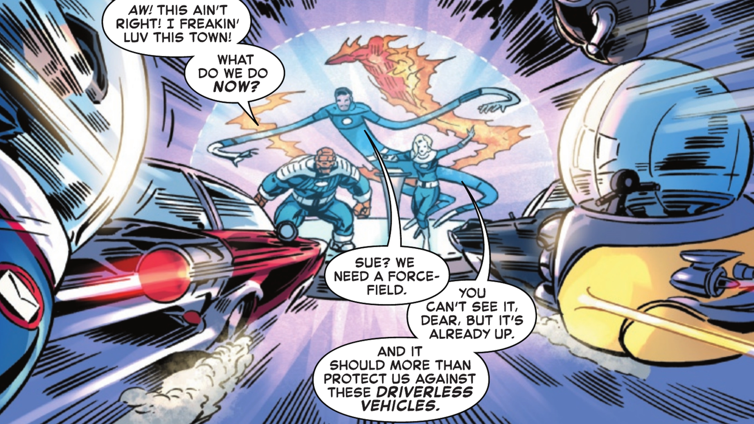 Things take a dark turn when Mister Fantastic steals Rodin’s ‘smart city’ concept. Rodin transforms into the Mad Thinker, a classic villain, and uses technology to try and kill his rivals in a chaotic attack on Times Square. The Fantastic Four narrowly win the intense battle by working together and thinking fast. This issue also includes a fun science segment with Mr. Fantastic explaining the possibility of flying cars, and a warning to Johnny Storm to stay away from Reed’s gadgets!