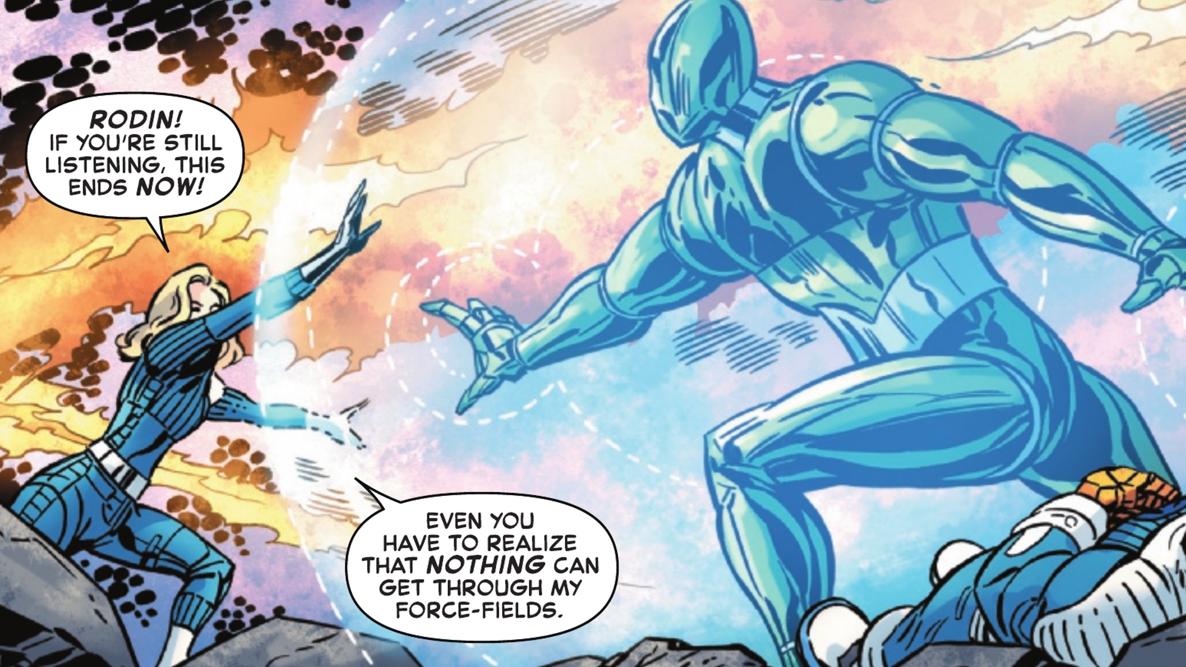 Mark Buckingham’s work is solid too. He faced a tough challenge – balancing accurate character designs based on the movie with the wild, sci-fi action the story demands. A few scenes, like the one with Mad Thinker’s robot, feel a bit rigid and don’t flow as smoothly as a typical Fantastic Four comic. However, his character designs perfectly capture the movie’s cool, retro-futuristic style, which is a definite strength.