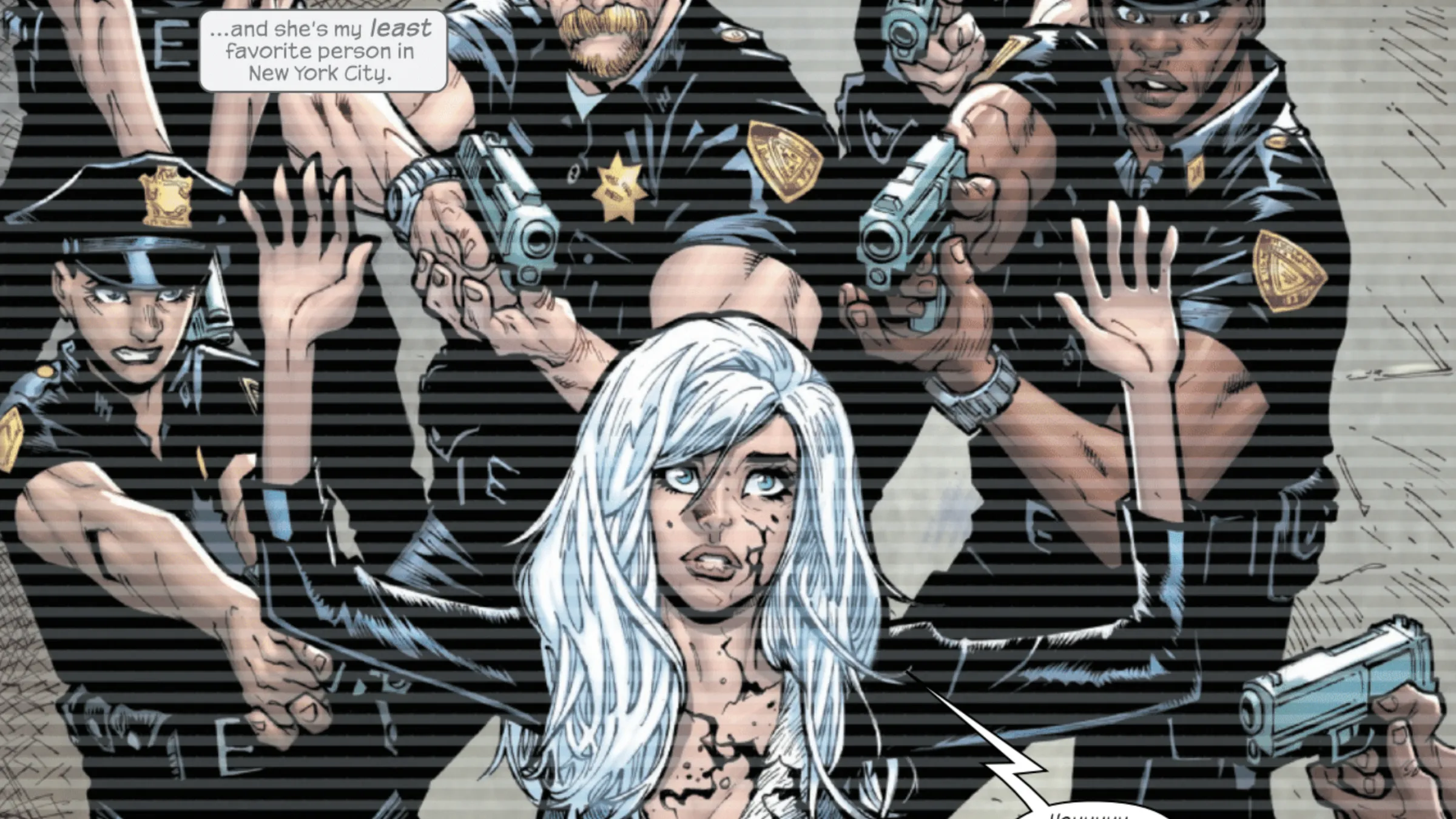 In issue #5, Mister Fantastic, the Thing, and the Human Torch went on a long fishing trip to the Negative Zone, leaving Sue and Alicia in charge of the Baxter Building. Shortly after they left, Black Cat arrived with the police pursuing her. Sue visited Felicia in jail, where Black Cat insisted she was falsely accused of murder. With Spider-Man off in space, she asked the Fantastic Four for assistance. Although Sue didn’t trust Felicia, she didn’t believe she was capable of murder and decided to investigate the situation.