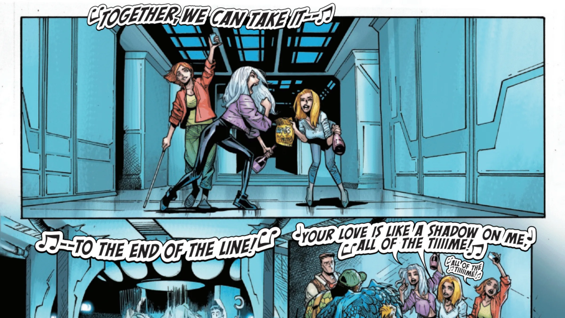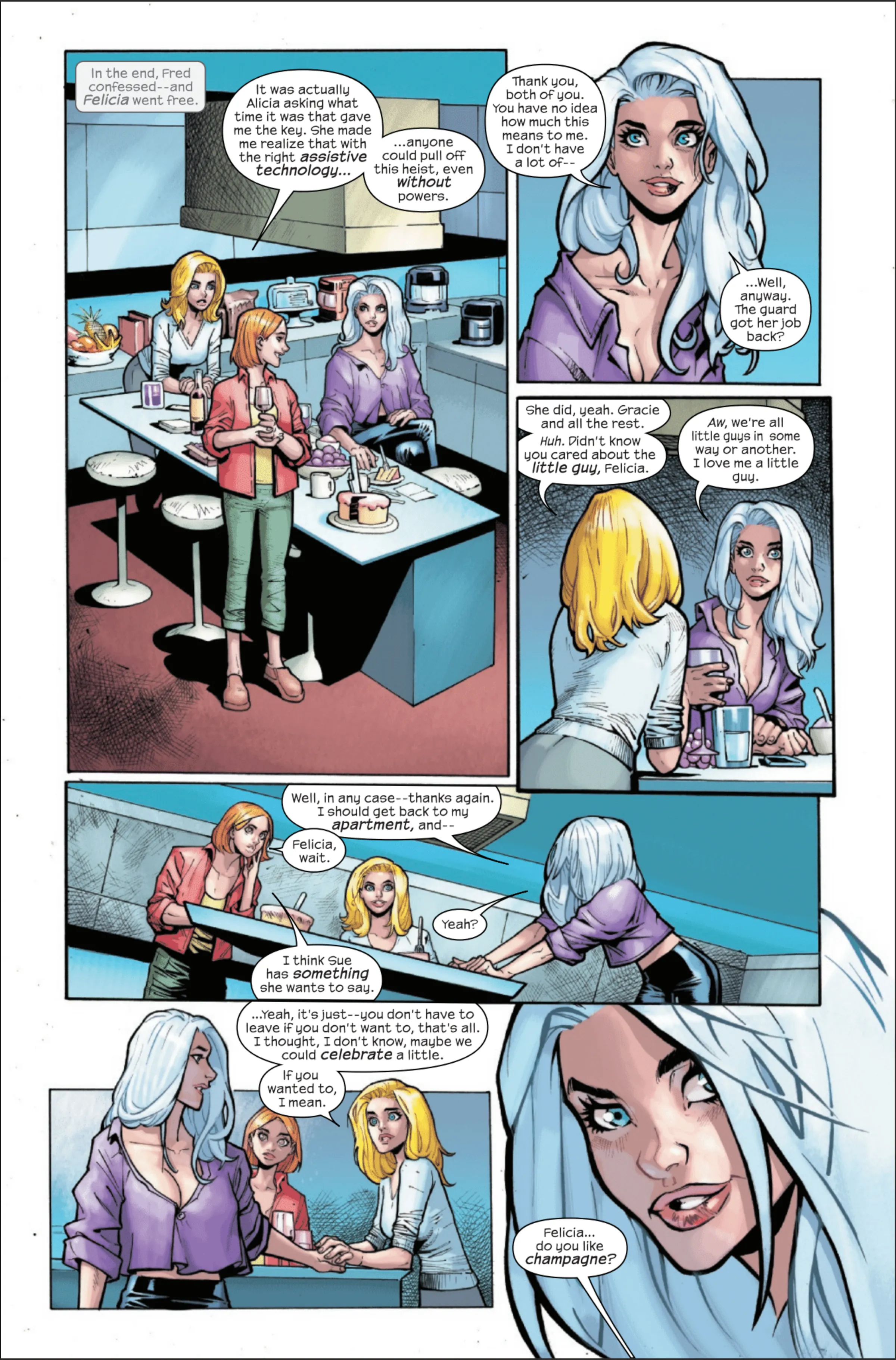 Someone obtained a time-altering weapon from Kang, but it only worked by sending people ten minutes forward in time. They used it to send Felicia and the security guards ahead, and unfortunately had to kill the bank teller after recognizing him. With Black Cat’s reputation restored, Invisible Woman, Alicia Masters, and Felicia Hardy decided to spend some time getting to know each other. The story concluded with the male characters returning from the Negative Zone, while the women immediately left for a fun weekend trip to Las Vegas.