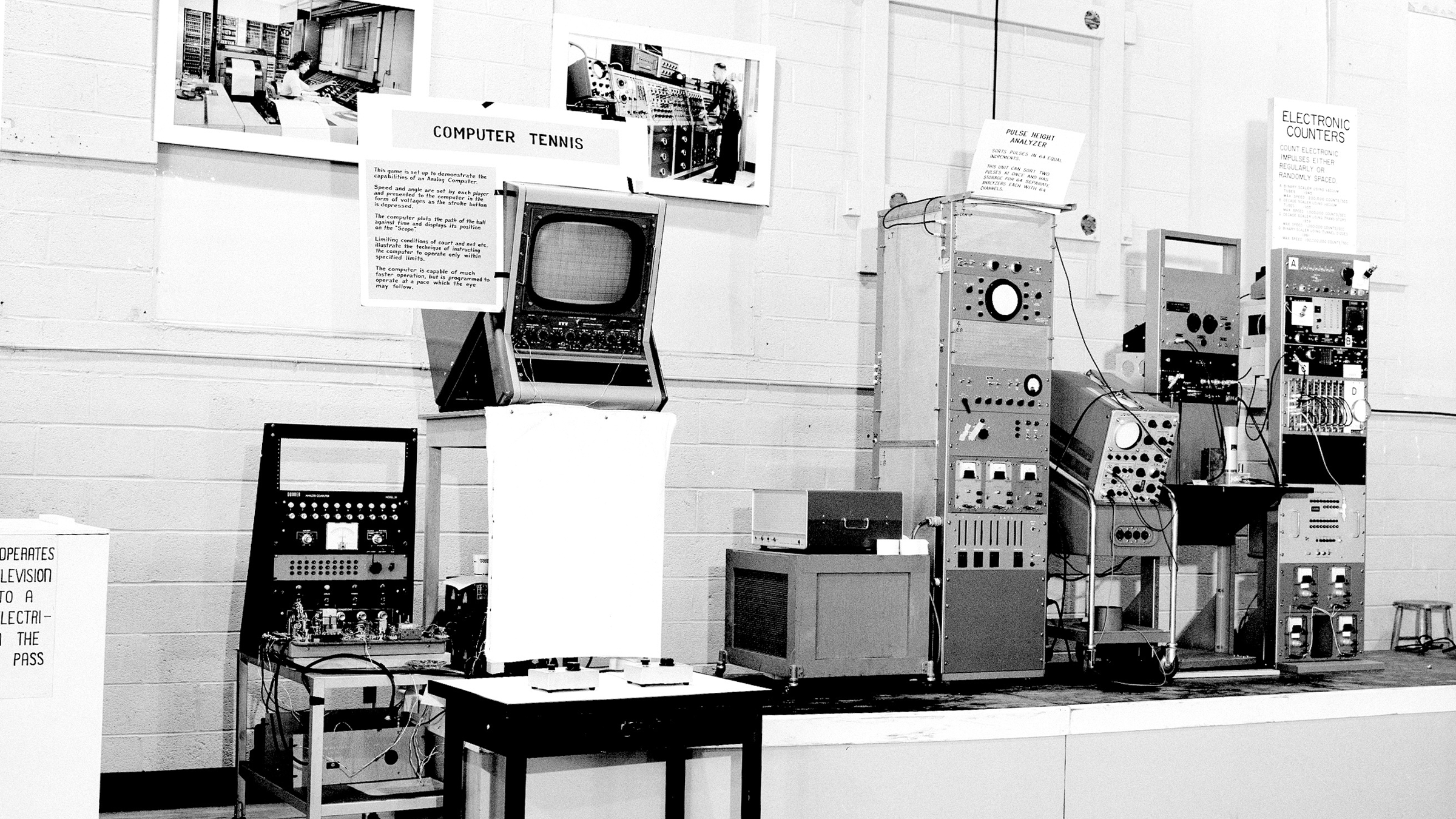 The game is played by turning a dial to aim, then pressing a button to launch the ball. Realistic physics governed the ball’s movement and gravity, allowing for strategic bounces in and out of the playing area, which created exciting and unpredictable gameplay. It was a major success at the three-day exhibition – people had never experienced anything like it before. Higinbotham built the game using a small analog computer; the computer’s components created the visuals you saw on the screen using curves displayed on an oscilloscope.