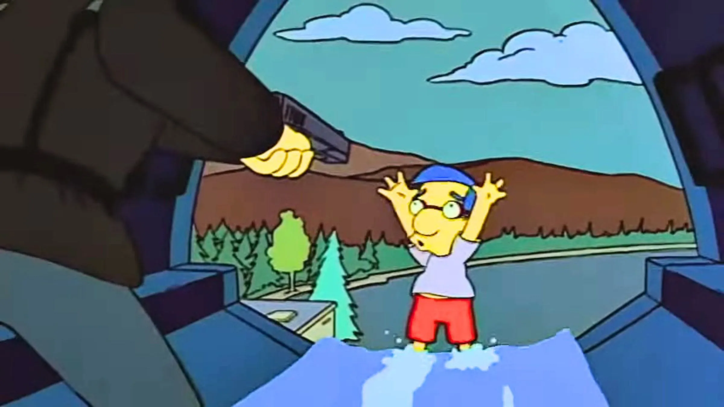 A hilarious GIF from an episode of The Simpsons referenced the movie The Fugitive. In the Season 6 episode “Lisa’s Rival,” a funny subplot involved the FBI mistakenly chasing Milhouse, believing him to be a criminal. The scene cleverly mirrored a famous moment from The Fugitive, with Milhouse cornered in a dam drainpipe as an FBI agent approached with a gun. The joke landed when Milhouse protested his innocence, saying, “I didn’t do anything,” and the agent bluntly replied, “I don’t care.”
