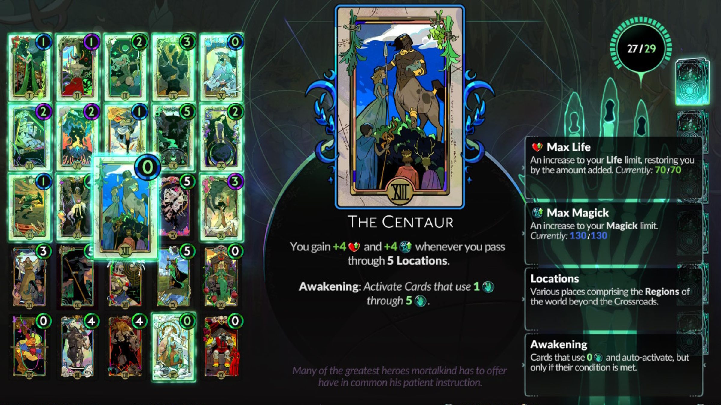 This card gradually restores your health and magic as you travel between locations – every five locations, to be exact. Once you unlock Moondust, you can increase the amount it restores. It provides reliable healing throughout the night without using up valuable resources, and it doesn’t require any Grasp to stay active. As long as you have at least one card with a Grasp cost between 1 and 5, this card will automatically heal you every five locations. This consistent healing can be crucial, and the fact that it’s free makes it particularly useful when building your Arcana deck.