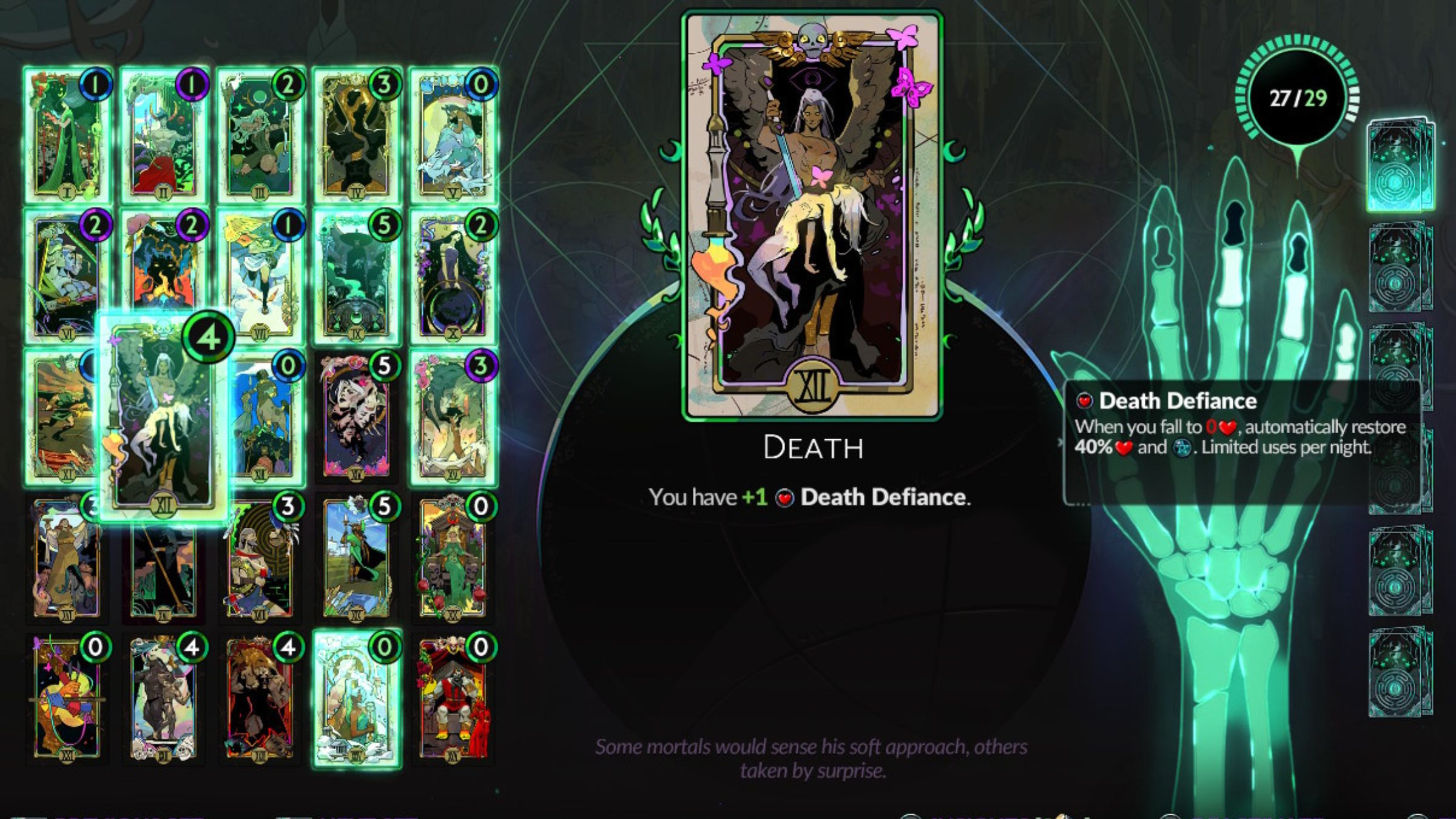 The Death card often has a negative connotation in Tarot, but it’s incredibly valuable in *Hades 2*. This card gives you ‘Death Defiance,’ essentially a second chance against challenging enemies, starting with the Hecate fight. Upgrading it restores more health and magic, making it even better. I always prioritize getting Death Defiance for tough boss battles, so I consider this card essential. It costs 4 grasp to acquire, which is relatively expensive for Melinoe’s Arcana, but a second life is worth the investment!