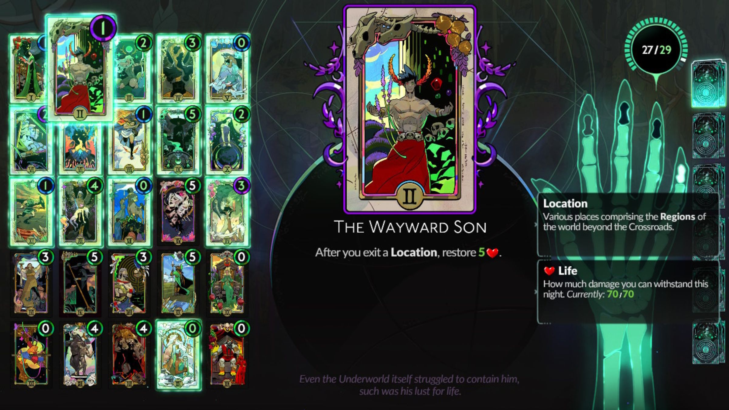 The Wayward Son card gives you a small amount of health back whenever you enter a new area. It’s not a huge heal, but it’s great for topping off your health between major healing opportunities. If you struggle with dodging attacks – and many players do! – this card lets you take an extra hit or two. Best of all, it only costs 1 grasp to add to your Arcana build, making it a valuable and easy addition to any Hades 2 deck. It’s a really solid card for a low cost, so it’s definitely worth keeping around.