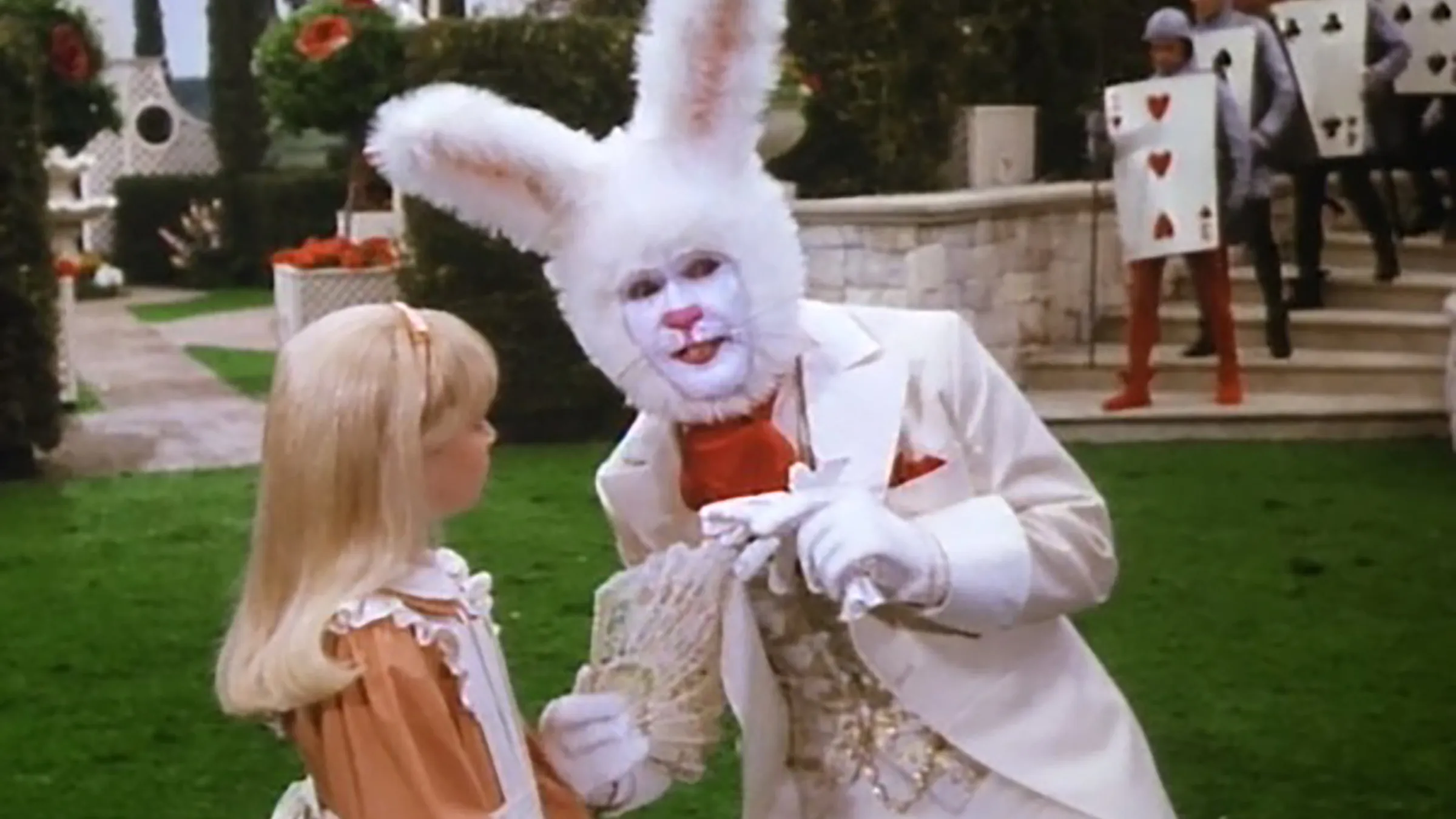 CBS’s version of Alice in Wonderland retold the familiar story of a girl named Alice who follows a White Rabbit down a rabbit hole and into a fantastical world. Like many adaptations of this classic tale—most notably the Disney animated film—it follows Alice’s journey to find her way home. However, the CBS production was unique for being entirely live-action and featured an incredibly large and star-studded cast. Natalie Gregory played Alice, with Red Buttons as the White Rabbit. Sammy Davis Jr. starred as the Caterpillar, Telly Savalas as the Cheshire Cat, and Ringo Starr as the Mock Turtle, with Beau Bridges as the Unicorn and Carol Channing as the White Queen. These are just a few of the many famous faces involved—Scott Baio, Roddy McDowall, Merv Griffin, Patrick Duffy, Harvy Korman, and John Stamos also appeared in the production.