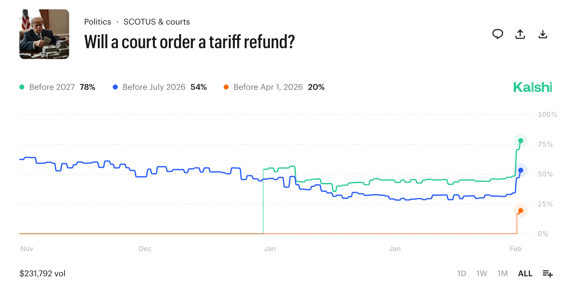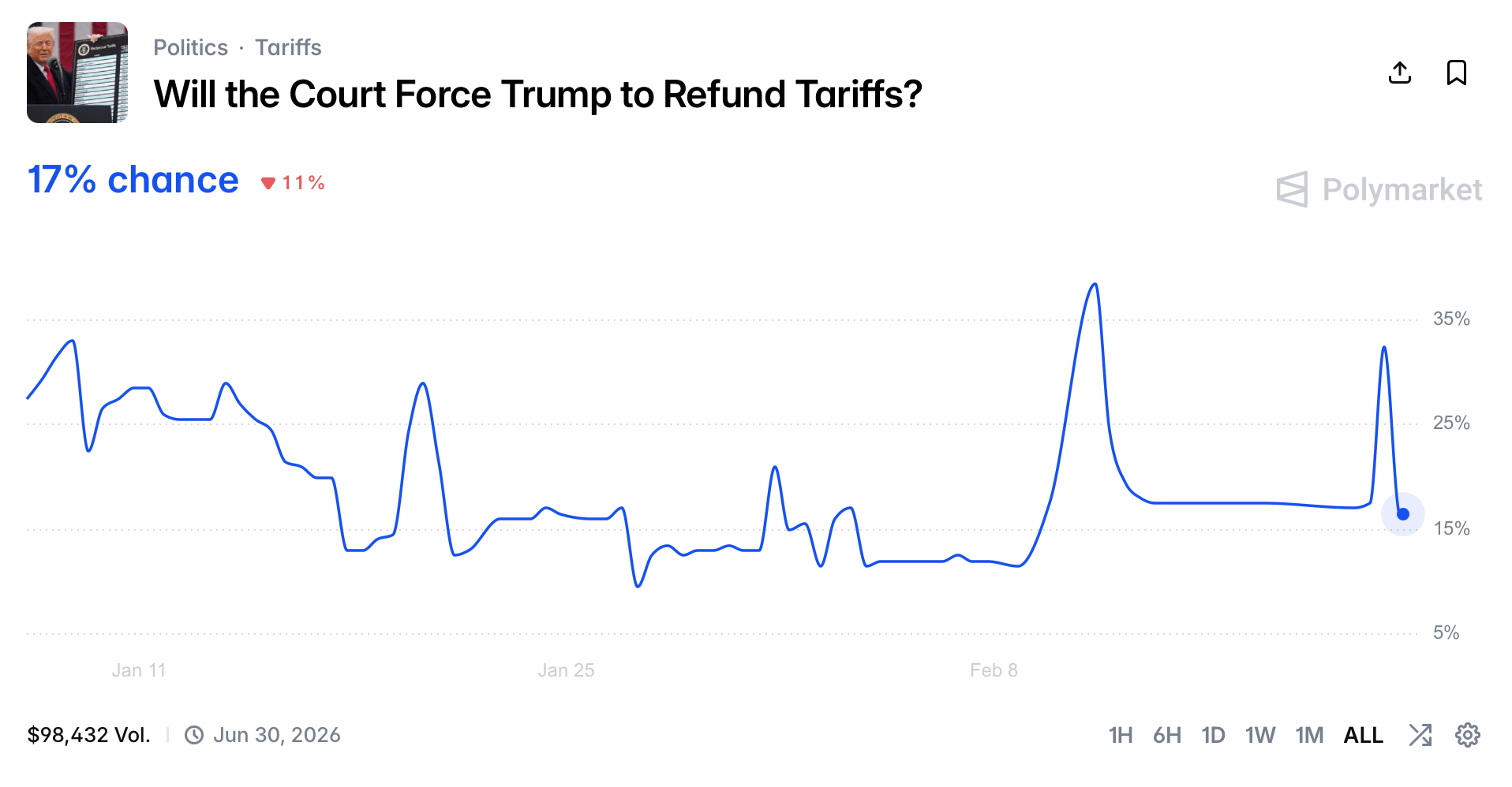 Whether Trump recalibrates his trade agenda through alternative statutes, escalates the legal fight or opts for a political counteroffensive, the Supreme Court’s ruling has clearly not ended the tariff saga – it has simply shifted the battlefield. For now, prediction markets are serving as a real-time barometer of expectations, translating legal uncertainty and political brinkmanship into percentages, price swings and hard dollars as traders wager on how the next chapter of U.S. trade policy will unfold.