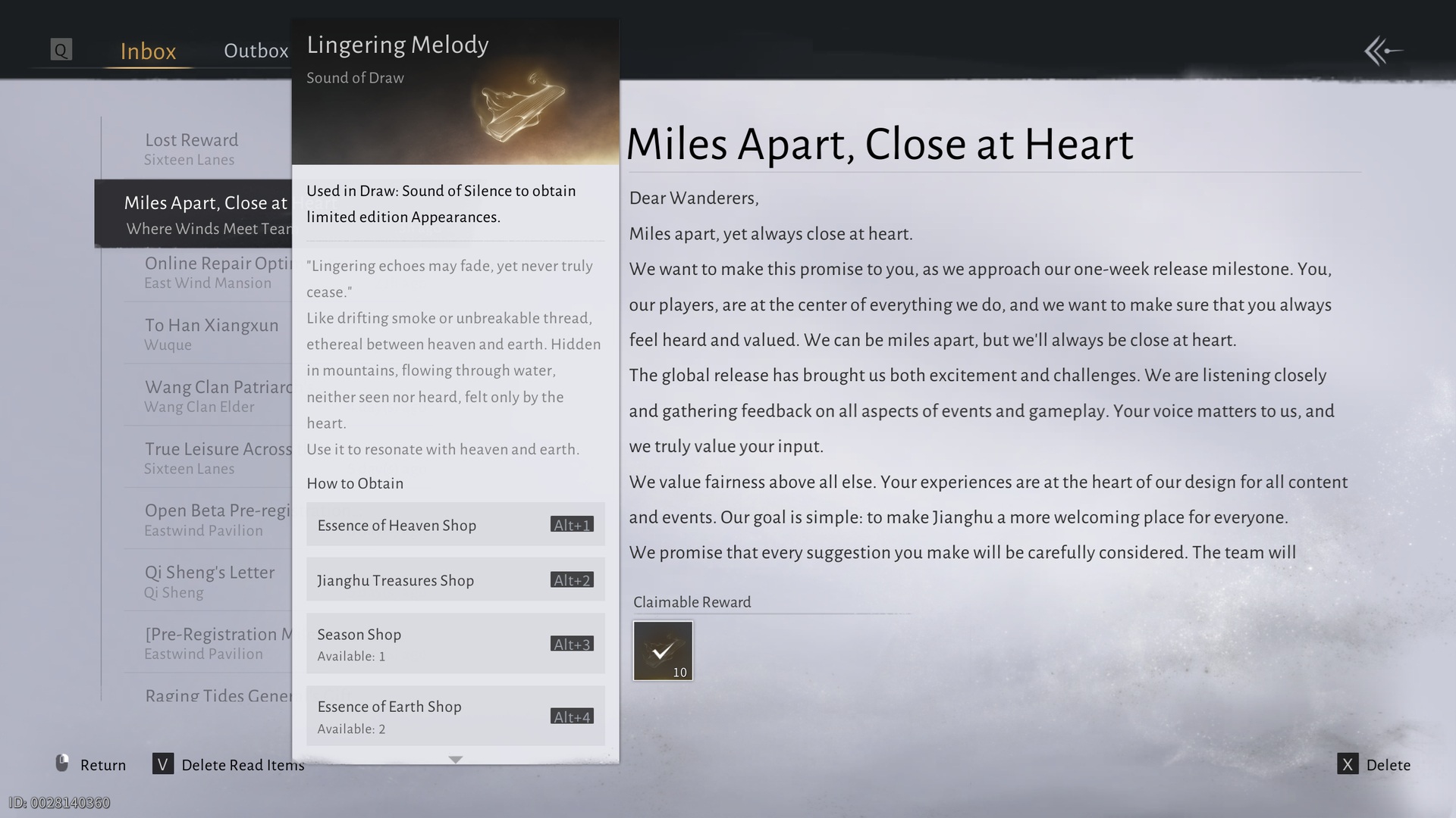 When you log in, you’ll receive a new in-game message. This message, titled “Miles Apart, Close at Heart,” will give you 10 Lingering Melody, which you can use to try your luck on the Celestial Echo banner in Where Winds Meet.
