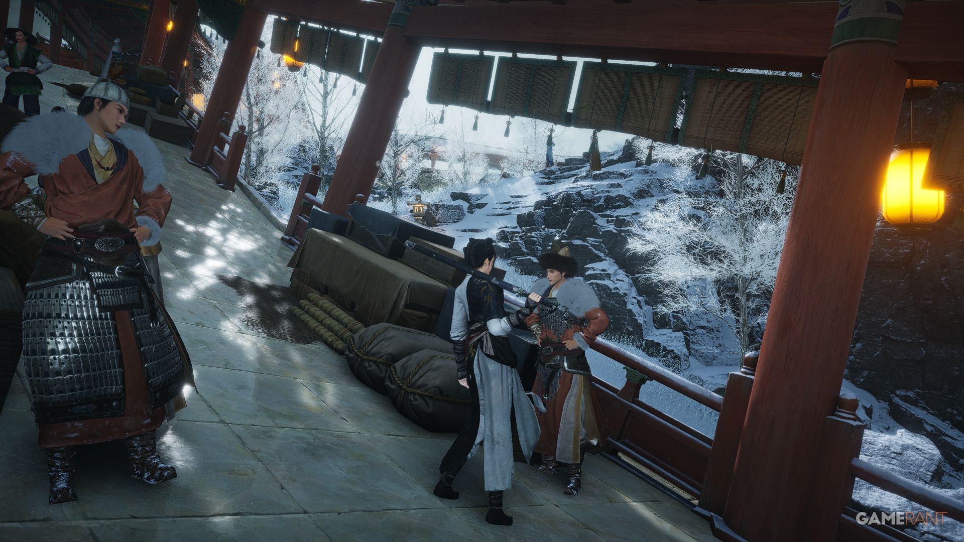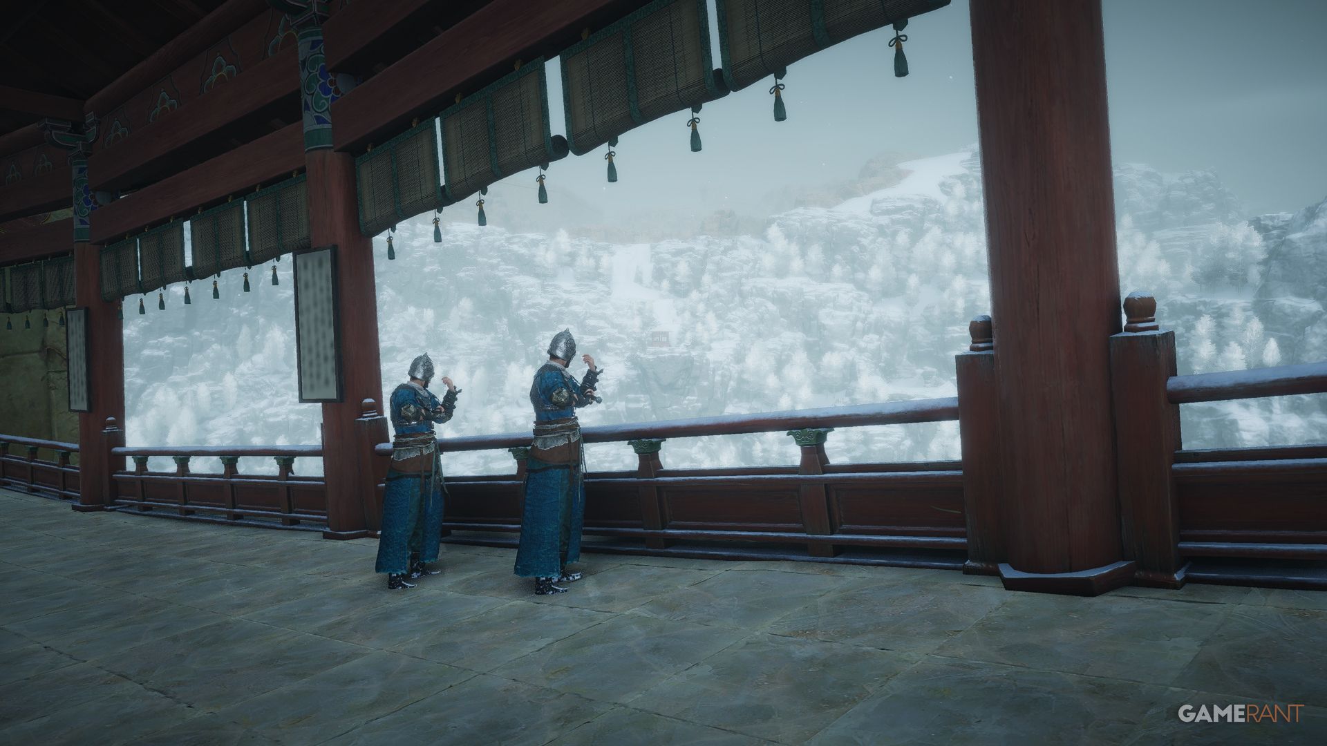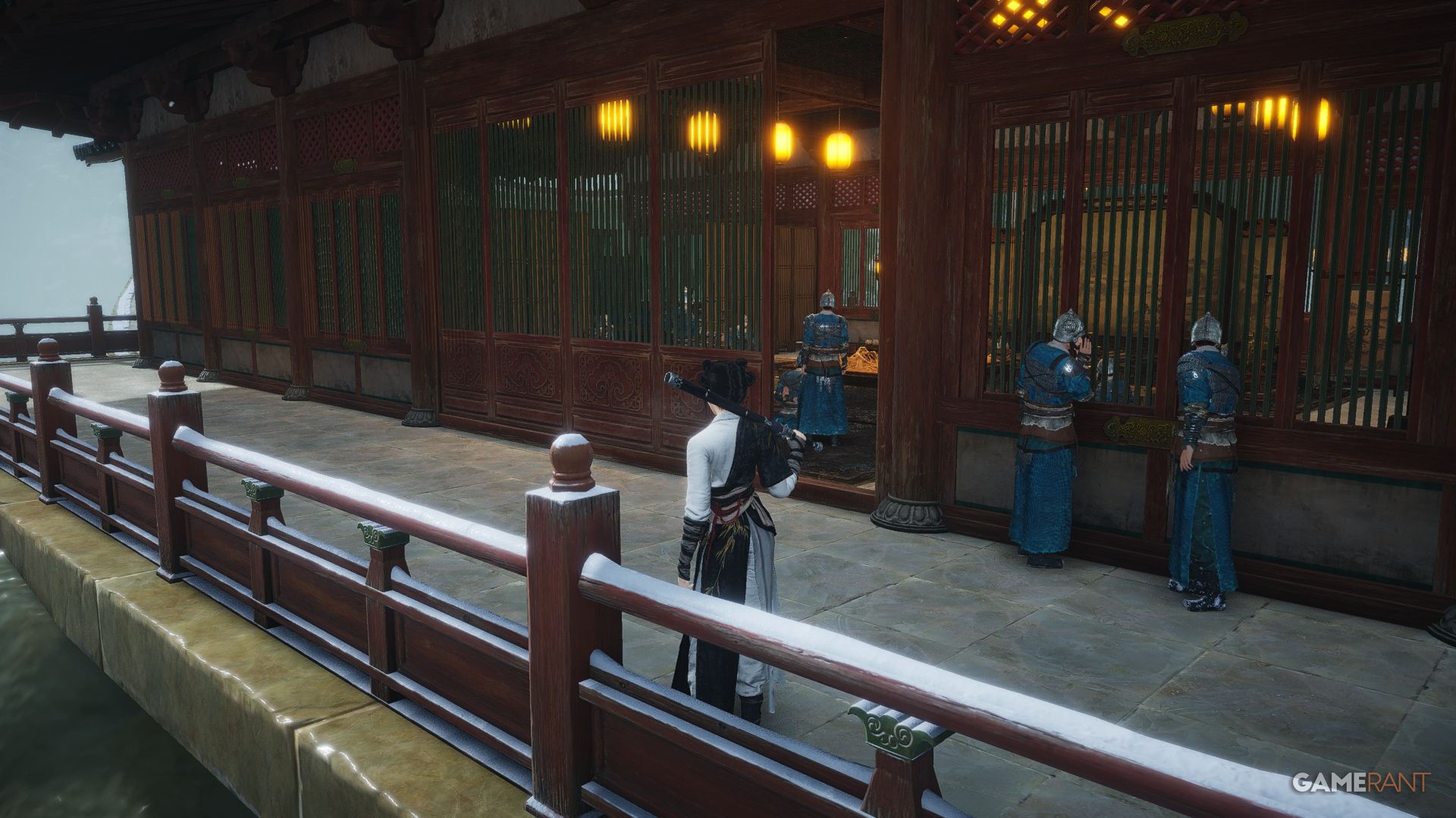 | Mirage Mirror Pavilion | From Mi Luoduo’s location, continue moving forward until you spot two armor-clad soldiers who are discussing the Mirror Tower and the destruction of the Flying Mirror Pavilion, which concludes this encounter. |