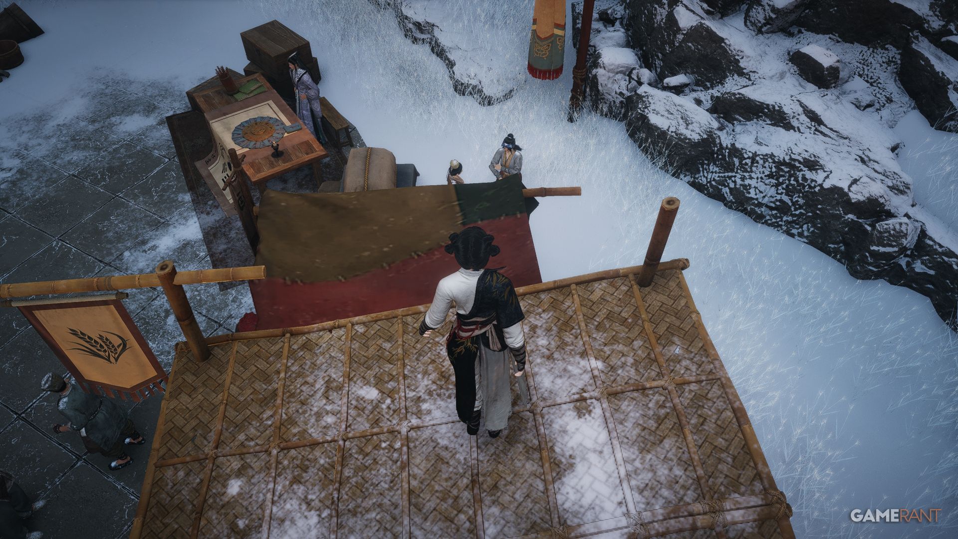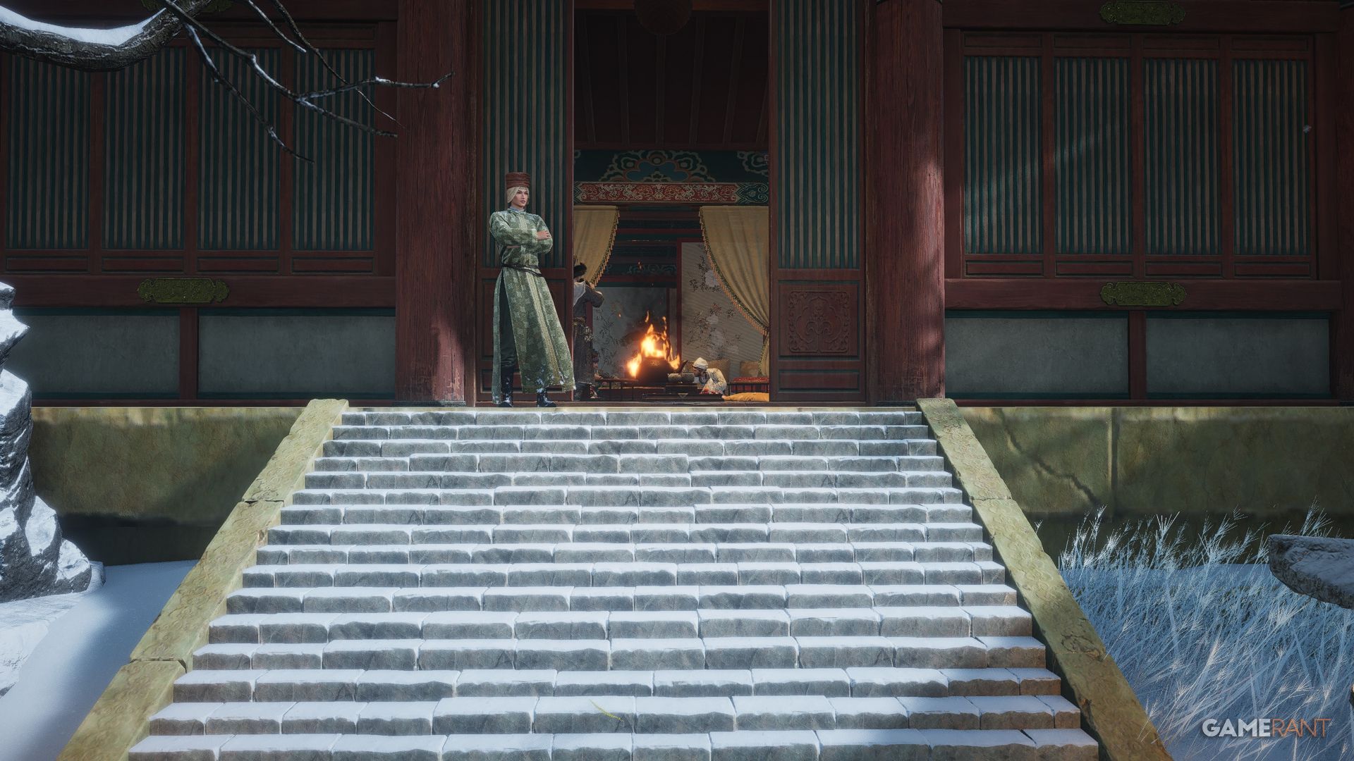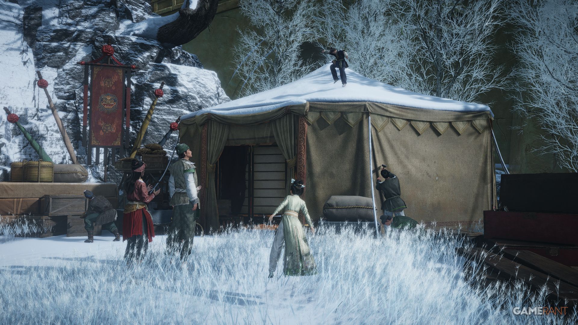 | Turbulent Times | From the Skybrim Market Boundary Stone in Jiuquan, follow the path heading northeast around the mountainside before heading up the stairs on your left and turning left again by the soldiers nearby. Make your way across the pathway and wrap around the building on the left, where you can eavesdrop on an important meeting to get this Anecdote. | |