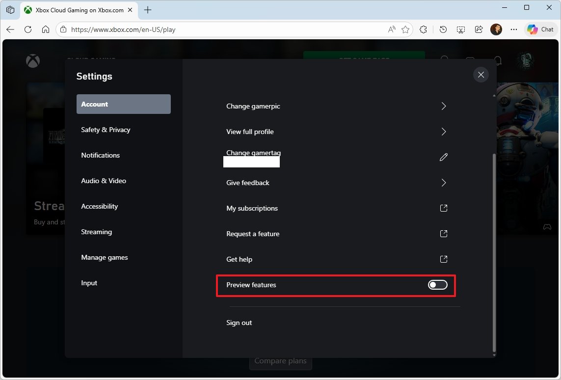 - Turn on the “Preview features” toggle switch to access the new Xbox Cloud experience.