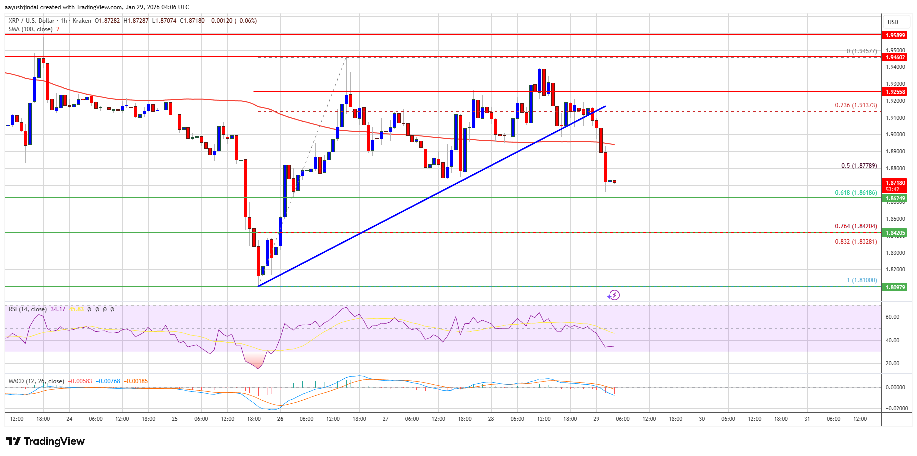 XRP couldn’t clear $1.950 and started a downside correction, like Bitcoin and Ethereum. The price dipped below the $1.90 and $1.880 levels to enter a negative zone.